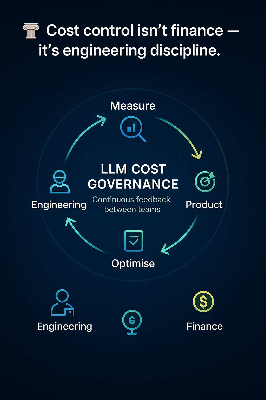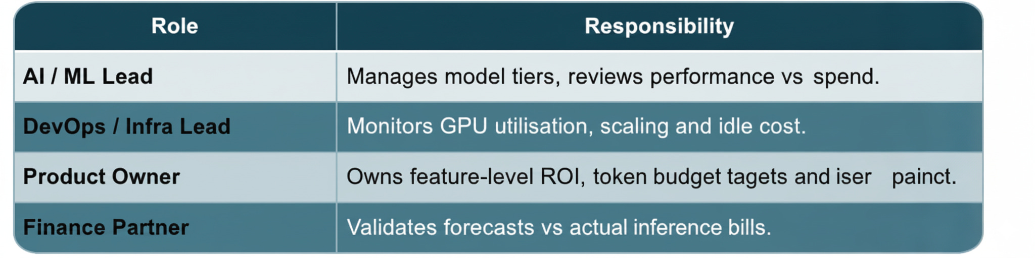 In Part2, we discussed engineering optimization but that alone won’t save you if governance is missing. Without ownership and measurement, even efficient pipelines drift - token budgets balloon, Tier-A models overused and no one owns the spend.