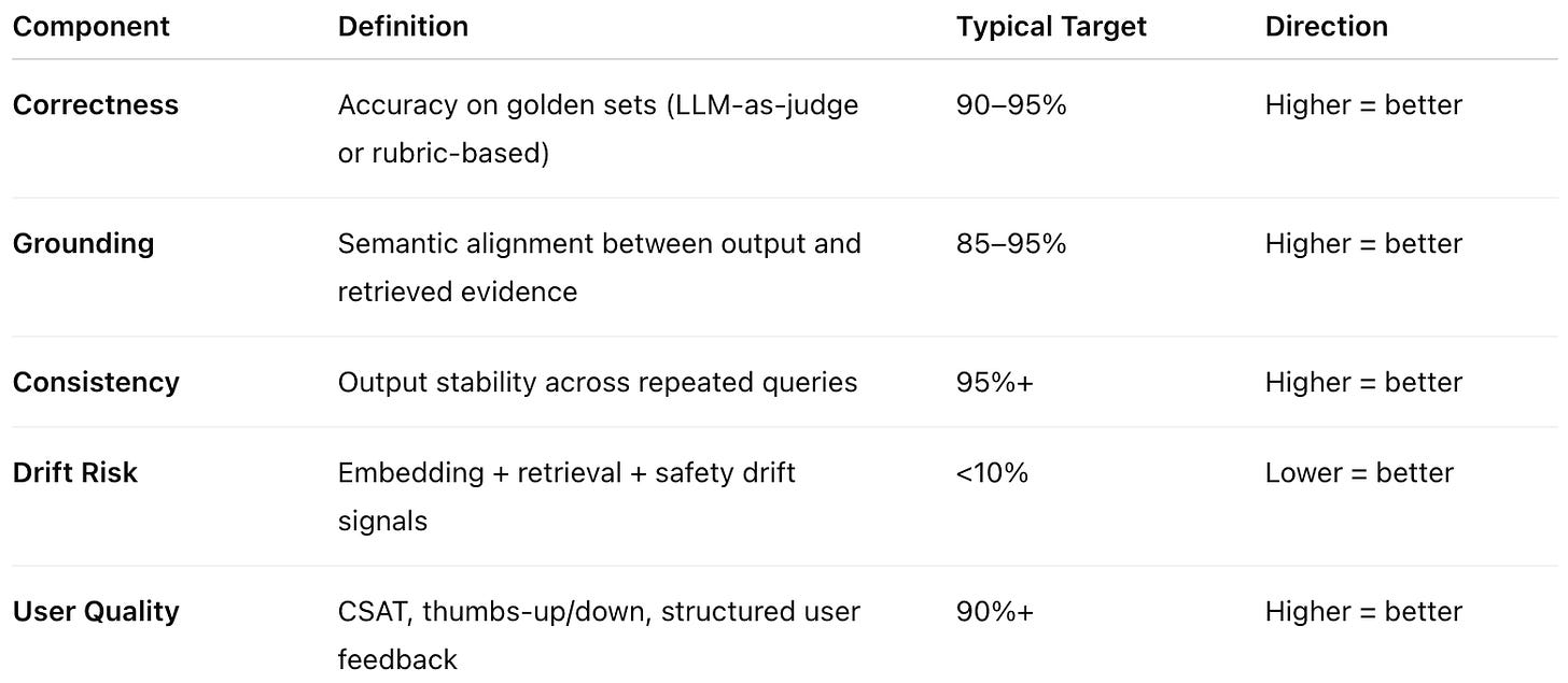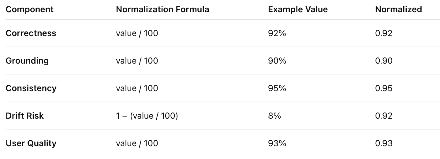 A 0.0–1.0 composite score that captures the long-term semantic reliability of your GenAI system across correctness, grounding, consistency, drift risk and user quality.