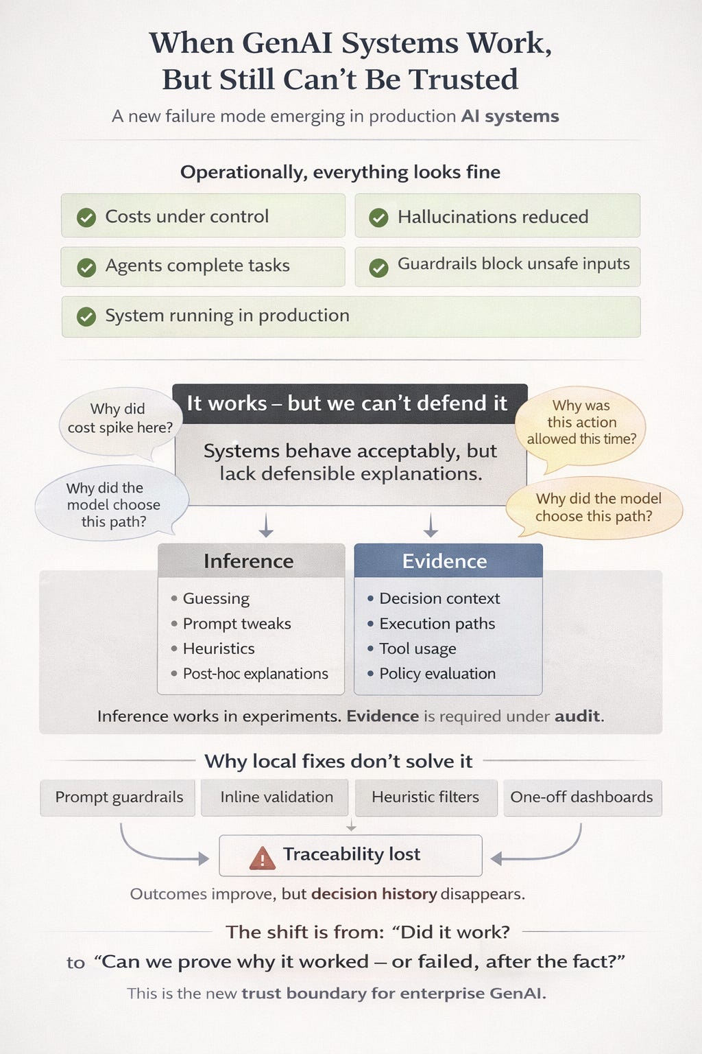 Systems behave acceptably in production, but lack defensible explanations when questioned.